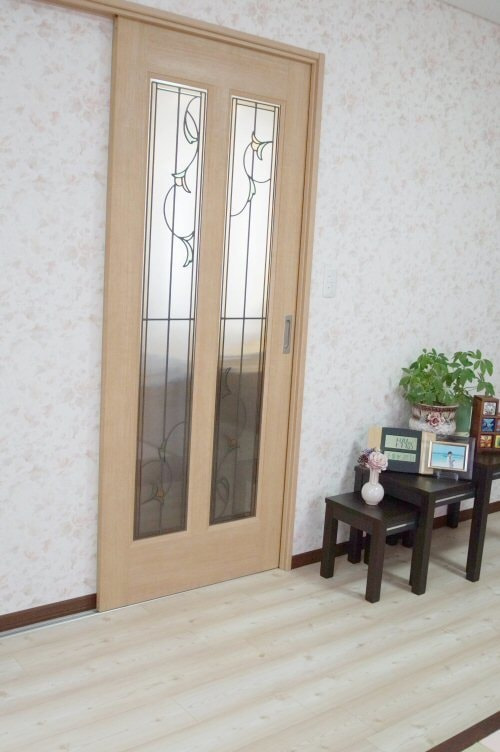 息子さんたちの成人を機に、2階の2つの子ども部屋を、奥様が欲しかった和の空間にして、セカンドライフを楽しくしたいとの思いがあったそうです。床は明るいフロアタイル、淡いピンクとグリーンの市松模様の置き畳は、なんと和紙素材。座り心地もよくて、ダニの心配もありません。冬は、念願のコタツライフ、夏はさわやかな畳生活。引き戸のステンドグラスもかわいくて奥様のイメージにぴったり!