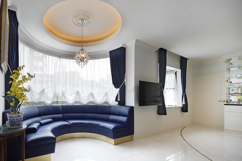 庭に造られた○○匹の鯉が泳ぐ池を臨むアールの空間には お二人の好きなブルーにゴールドを効かせたオーダーソファ。